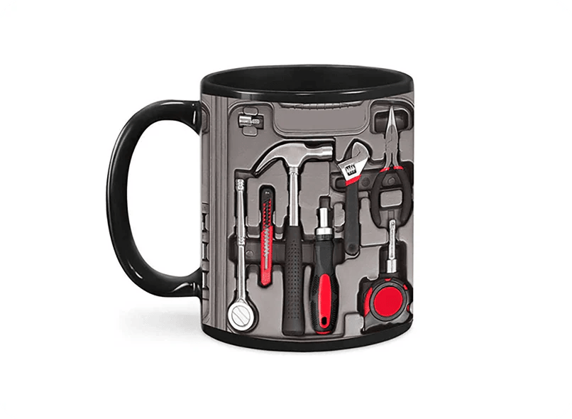✅️The mug replicates an entire toolbox exterior, complete with hammer, screwdriver, pliers, and tape measure—even down to the metal rivet details! Placed at your workspace, it looks like you just pulled out a professional toolkit.