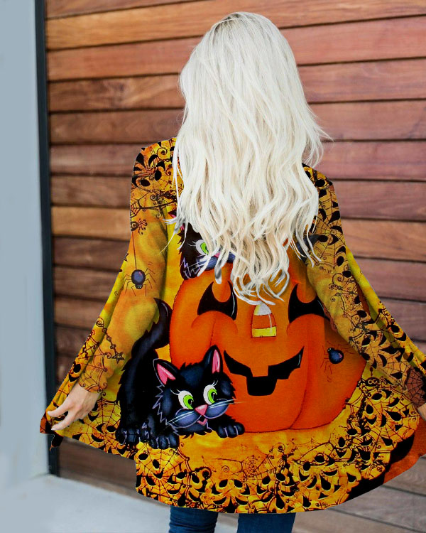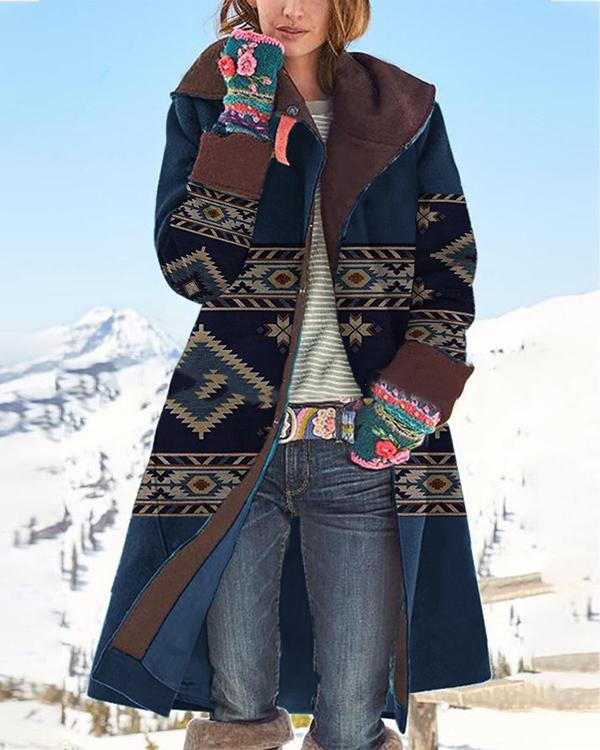 Women Vintage Print Button Long Sleeve Woolen Warm Coat