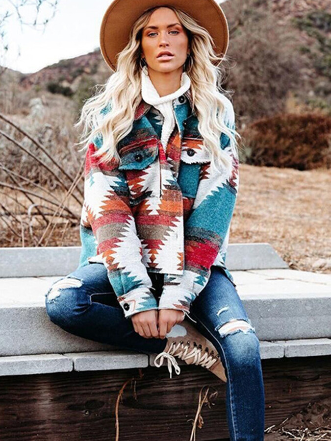 Women's AZTEC retro ethnic geometric print woolen loose coat.