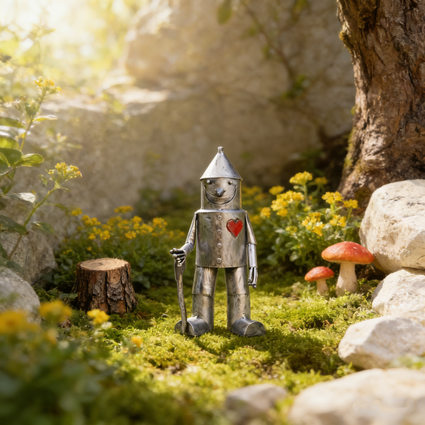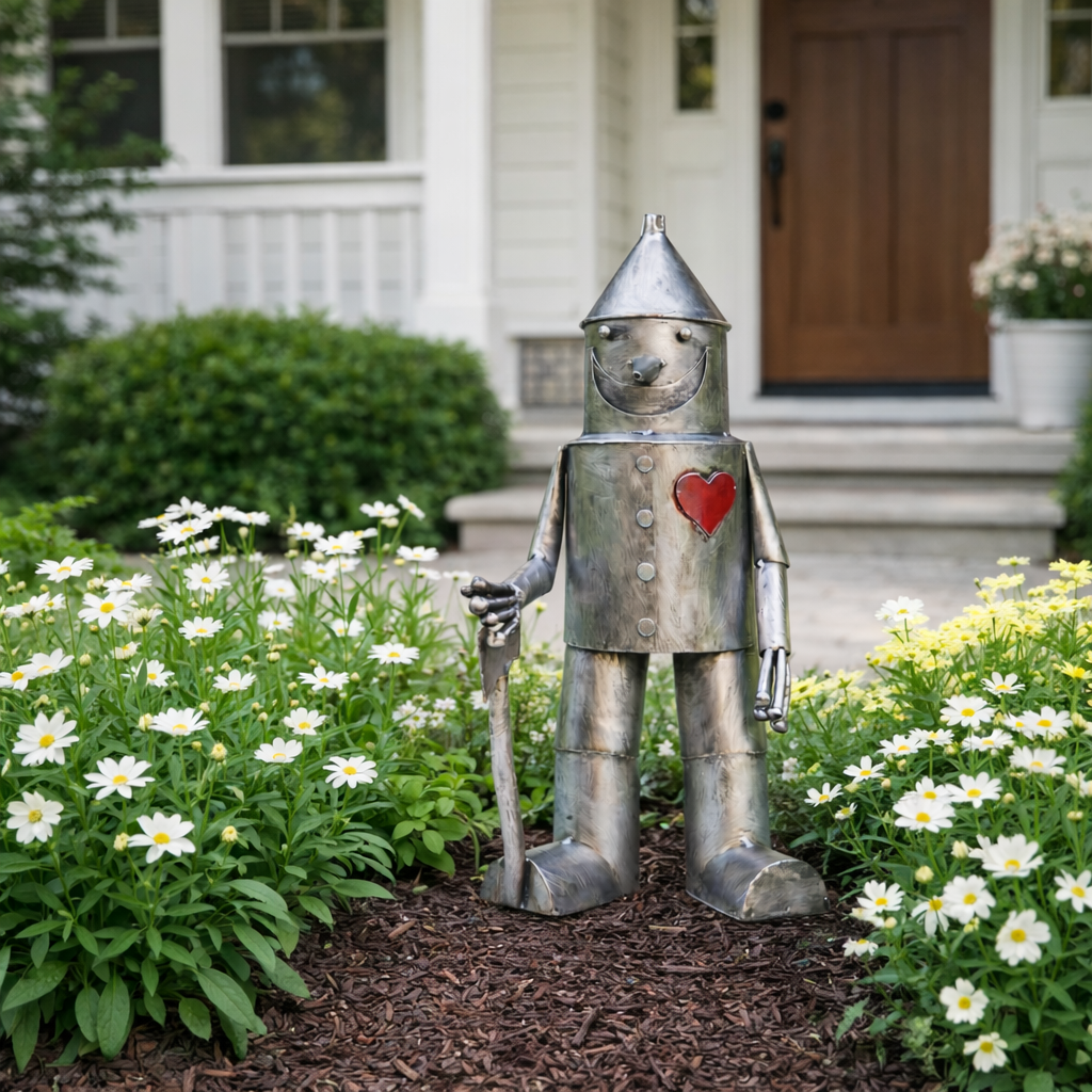 This charming tin man sculpture, with its radiant smile, conical hat, and iconic red heart, instantly adds personality and a touch of fantasy to your garden or patio.