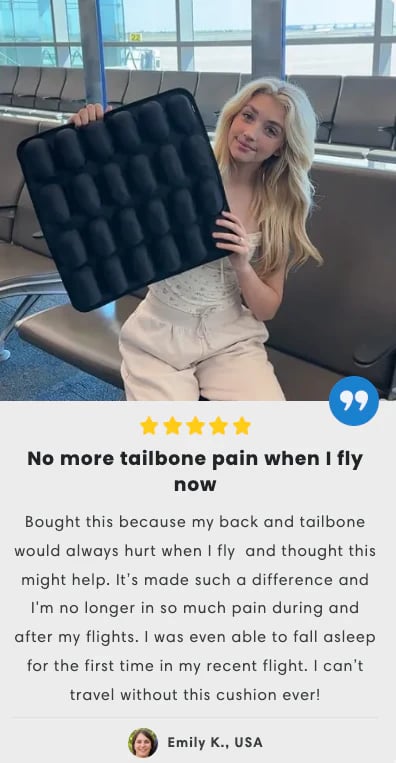 Many customers have reported significant relief from pain and discomfort when using the travel cushion when traveling. The 64 Air Cells helps redistribute pressure and gently hugs and supports your bottom, providing relief from any pain and discomfort.