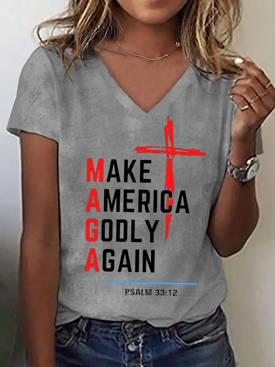 Women's Jesus Make America Godly Again MAGA Print V-Neck T-Shirt