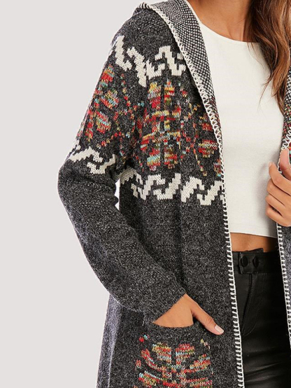 long sleeve cardigan jacquard weave knitted hooded women sweater duster coat