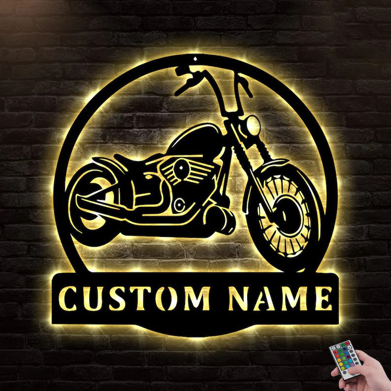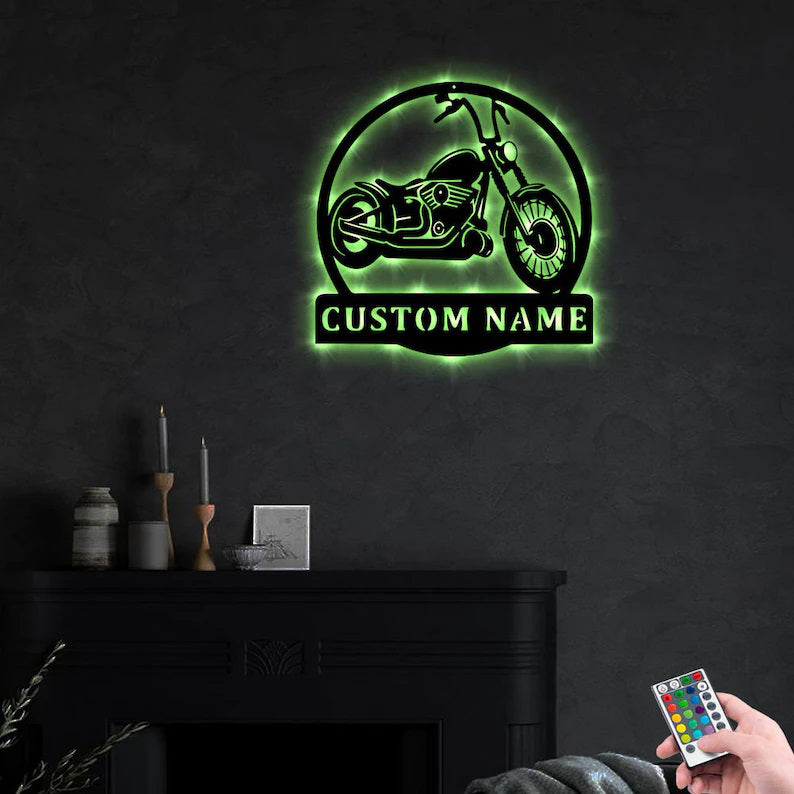 This custom motorcycle metal wall art will be an eye-catching addition to any room. With its laser-cut metal sign design featuring a motorcycle and LED lights, this piece of art provides an attractive, illuminated holiday gift or home decoration. Dependable and sturdy, it will add a unique glow to any space for years to come.