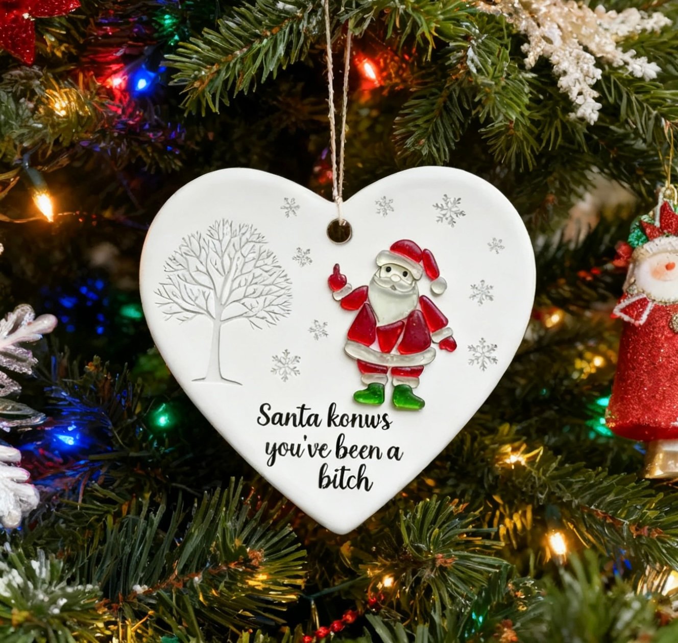 These Christmas heart-shaped ornaments, with a touch of humor and playfulness, add a touch of color to the holiday spirit. Imagine Santa Claus secretly giving you a wink on a snowy night, as if to say, "Hey, I saw how you behaved this year, you little naughty boy!"