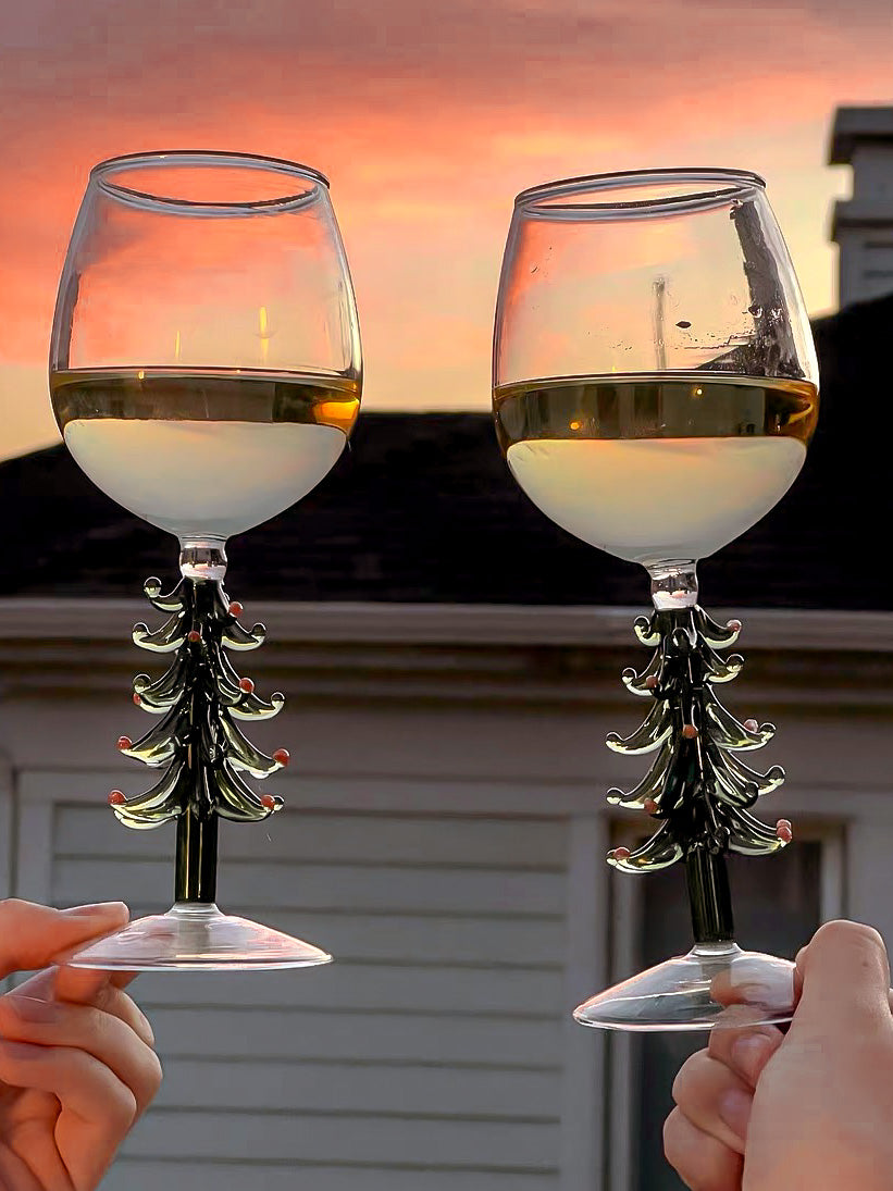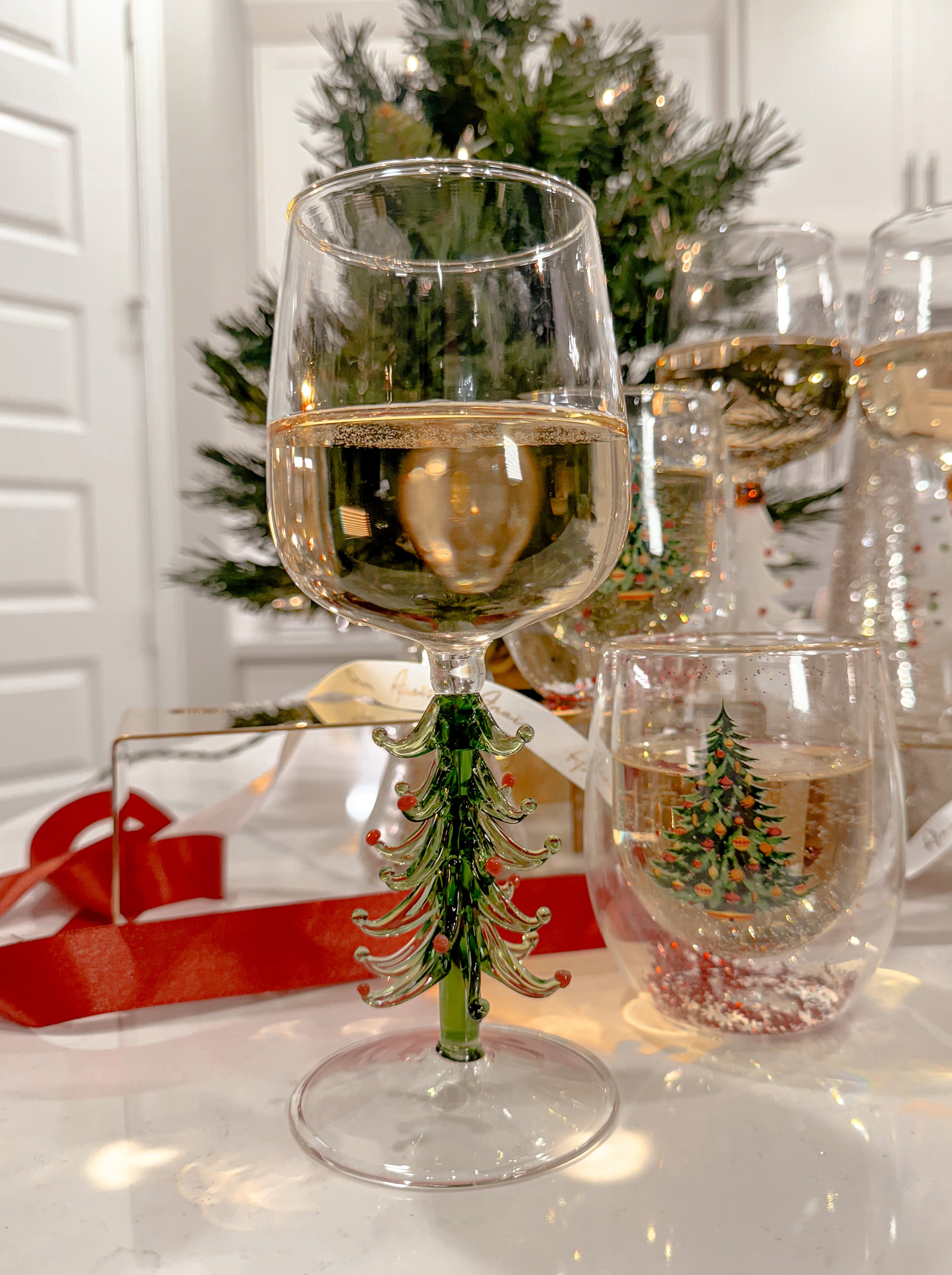 Each glass adorned with Christmas cheer,