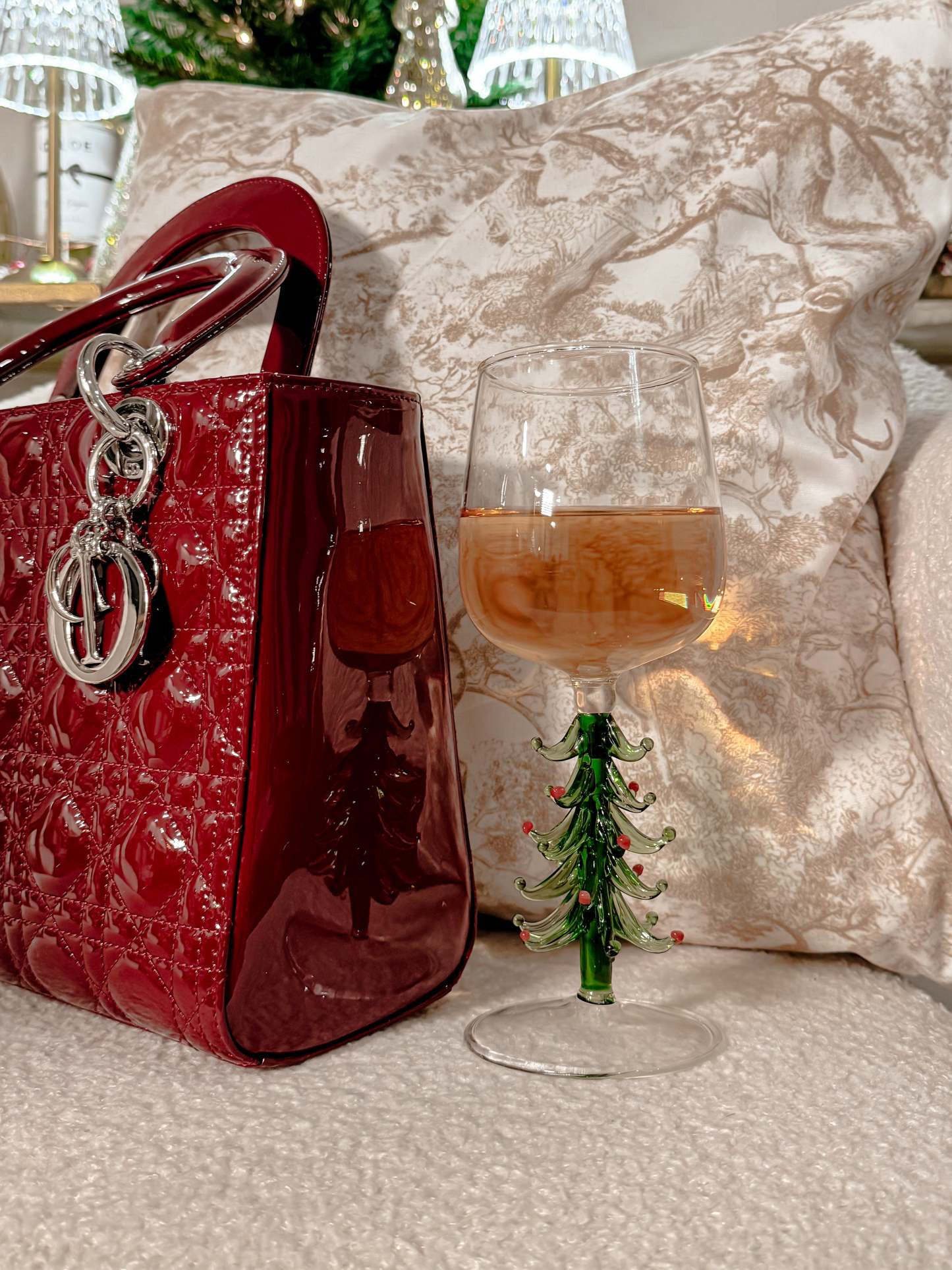 Holding wine in holiday light,